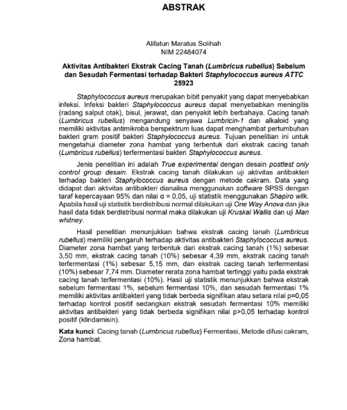 Solihah, Alifatun Maratus and Irianto, I.D.K. and Rahmatullah, Widia (2025) AKTIVITAS ANTIBAKTERI EKSTRAK CACING TANAH (Lumbricus rubellus) SEBELUM DAN SESUDAH FERMENTASI TERHADAP BAKTERI Staphylococcus aureus ATTC 25923. Diploma thesis, Politeknik Kesehatan Bhakti Setya Indonesia.
