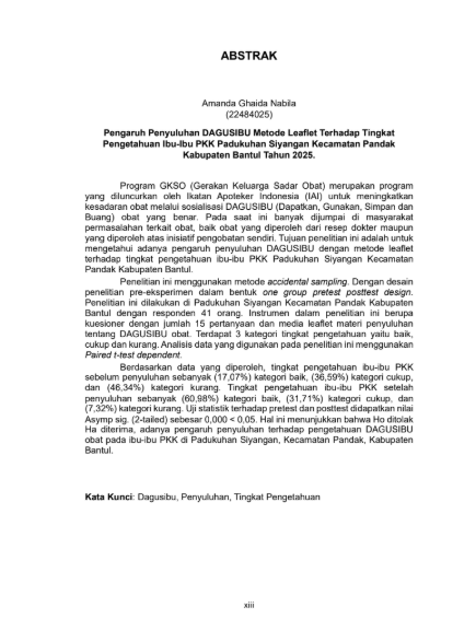 Nabila, Amanda Ghaida and Nurhaeni, Farisya and Ismiyati, Ismiyati (2025) PENGARUH PENYULUHAN DAGUSIBU METODE LEAFLET TERHADAP TINGKAT PENGETAHUAN IBU-IBU PKK PADUKUHAN SIYANGAN KECAMATAN PANDAK KABUPATEN BANTUL TAHUN 2024. Diploma thesis, Politeknik Kesehatan Bhakti Setya Indonesia.