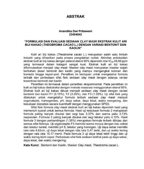 Kulit ari biji kakao (Theobroma cacao L.) merupakan salah satu limbah industri yang dihasilkan pada proses pengolahan coklat. Aktivitas antioksidan ekstrak kulit ari biji kakao dengan pelarut etanol 95% diperoleh nilai IC50 49,89 ppm yang termasuk dalam katagori sangat kuat. Ekstrak kulit ari biji kakao diformulasikan menjadi clay mask. Masker clay mask merupakan masker wajah berbahan dasar bentonit dan kaolin yang mampu mengangkat kotoran dan komedo hingga kepori-pori. Penelitian ini bertujuan untuk mengetahui formula terbaik dan perbedaan sifat fisik sediaan clay mask dengan adanya variasi kosentrasi bentonit dan kaolin.