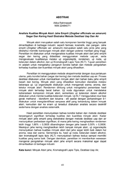 Minyak atsiri merupakan salah satu komponen bernilai tinggi yang banyak dimanfaatkan di berbagai industri, seperti farmasi, kosmetik, dan pangan. Jahe emprit (Zingiber officinale var. amarum) merupakan salah satu jenis jahe yang diketahui memiliki kandungan minyak atsiri dengan potensi manfaat yang tinggi. Penelitian ini dilakukan untuk menganalisis kualitas minyak atsiri dari jahe emprit segar dan kering yang didestilasi menggunakan metode uap-air, serta mengevaluasi kualitasnya melalui uji organoleptik, rendemen, uji noda, uji kelarutan dalam alkohol, dan uji Kromatografi Lapis Tipis (KLT). Tujuan penelitian ini adalah untuk mengetahui pengaruh kondisi bahan dan metode pengolahan terhadap kualitas dan kuantitas minyak atsiri yang dihasilkan.