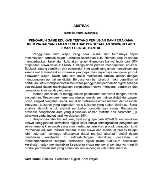 Penggunaan krim wajah yang tidak sesuai dan berbahaya dapat menimbulkan dampak negatif terhadap kesehatan kulit. Remaja saat ini sangat memperhatikan kesehatan kulit akan tetapi ditemukan bahwa lebih dari 50% responden siswa kelas x SMAN 1 Dlingo tidak pernah mendapatkan edukasi. Edukasi tentang pemilihan dan pemakaian krim wajah yang aman menjadi penting karena untuk memberikan informasi yang tepat dan terpercaya mengenai produk perawatan wajah. Salah satu cara untuk melakukan edukasi adalah dengan menggunakan permainan digital. Berdasarkan hal tersebut maka penelitian ini bertujuan untuk mengeksplorasi efektivitas penggunaan permainan digital sebagai alat edukasi dalam meningkatkan pengetahuan siswa mengenai pemilihan dan pemakaian krim wajah yang aman.