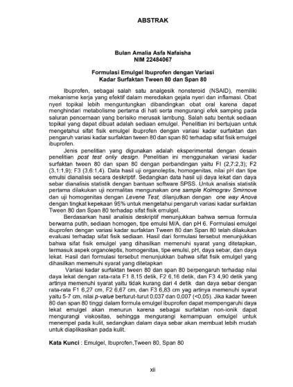 Nafaisha, Bulan Amalia Asfa and Widiastuti, Rina and Ismiyati, Ismiyati (2025) FORMULASI EMULGEL IBUPROFEN DENGAN VARIASI KADAR SURFAKTAN TWEEN 80 DAN SPAN 80. Diploma thesis, Politeknik Kesehatan Bhakti Setya Indonesia.