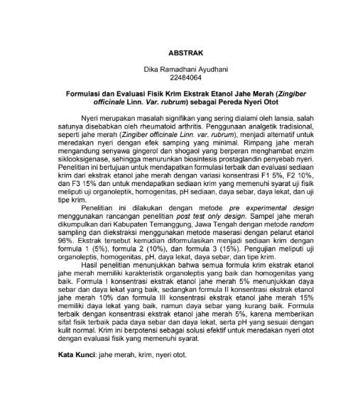 Ayudhani, Dika Ramadhani and Sulistyowati, Rini and Rini, Yuli Puspito (2025) FORMULASI DAN EVALUASI FISIK KRIM EKSTRAK ETANOL JAHE MERAH (Zingiber officinale Linn. Var. rubrum) SEBAGAI PEREDA NYERI OTOT. Diploma thesis, Politeknik Kesehatan Bhakti Setya Indonesia.