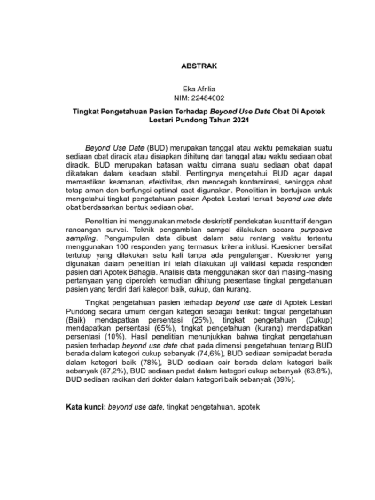 Afrilia, Eka and Rini, Yuli Puspito and Nurhaeni, Farisya (2025) TINGKAT PENGETAHUAN PASIEN TERHADAP BEYOND USE DATE OBAT DI APOTEK LESTARI PUNDONG TAHUN 2024. Diploma thesis, Politeknik Kesehatan Bhakti Setya Indonesia.