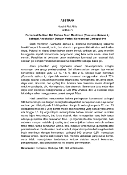 Alifia, Nuraini Fitri and Widiastuti, Rina and Ismiyati, Ismiyati (2025) FORMULASI GEL EKSTRAK BUAH MENTIMUN (Curcumis sativus L ) SEBAGAI ANTIOKSIDAN DENGAN VARIASI KONSENTRASI CARBOPOL 940. Diploma thesis, Politeknik Kesehatan Bhakti Setya Indonesia.