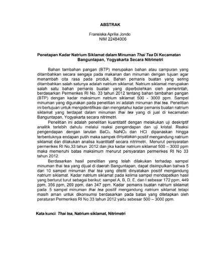 Bahan tambahan pangan (BTP) merupakan bahan atau campuran yang ditambahkan secara sengaja pada makanan dan minuman dengan tujuan agar menambah cita rasa pada produk. Bahan pemanis buatan yang sering ditambahkan salah satunya adalah natrium siklamat. Natrium siklamat merupakan salah satu bahan pemanis buatan yang diperbolehkan oleh pemerintah, berdasarkan Permenkes RI No. 33 tahun 2012 tentang bahan tambahan pangan (BTP) dengan kadar maksimum natrium siklamat 500 - 3000 ppm. Sampel minuman yang digunakan pada penelitian ini adalah minuman thai tea. Penelitian ini bertujuan untuk mengidentifikasi dan mengetahui kadar pemanis buatan natrium siklamat yang terdapat dalam minuman thai tea yang di jual di kecamatan Banguntapan, Yogyakarta secara nitrimetri.