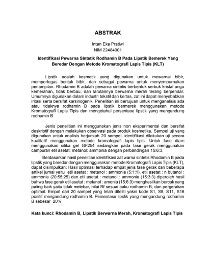 Lipstik adalah kosmetik yang digunakan untuk mewarnai bibir, mempertegas bentuk bibir, dan sebagai pewarna untuk menyempurnakan penampilan. Rhodamin B adalah pewarna sintetis berbentuk serbuk kristal ungu kemerahan, tidak berbau, dan larutannya berwarna merah terang berpendar. Umumnya digunakan dalam industri tekstil dan kertas, zat ini dapat menyebabkan iritasi serta bersifat karsinogenik. Penelitian ini bertujuan untuk menganalisis ada atau tidaknya rodhamin B pada lipstik bermerek menggunakan metode Kromatografi Lapis Tipis dan mengetahui persentase lipstik yang mengandung rodhamin B