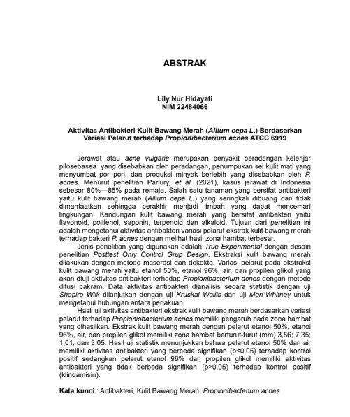 Jerawat atau acne vulgaris merupakan penyakit peradangan kelenjar pilosebasea yang disebabkan oleh peradangan, penumpukan sel kulit mati yang menyumbat pori-pori, dan produksi minyak berlebih yang disebabkan oleh P. acnes. Menurut penelitian Pariury, et al. (2021), kasus jerawat di Indonesia sebesar 80%—85% pada remaja. Salah satu tanaman yang bersifat antibakteri yaitu kulit bawang merah (Allium cepa L.) yang seringkali dibuang dan tidak dimanfaatkan sehingga berakhir menjadi limbah yang dapat mencemari lingkungan. Kandungan kulit bawang merah yang bersifat antibakteri yaitu flavonoid, polifenol, saponin, terpenoid dan alkaloid. Tujuan dari penelitian ini adalah mengetahui aktivitas antibakteri variasi pelarut ekstrak kulit bawang merah terhadap bakteri P. acnes dengan melihat hasil zona hambat terbesar.