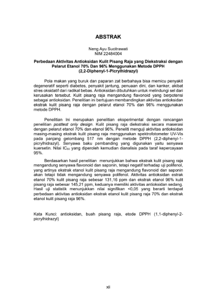 Pola makan yang buruk dan paparan zat berbahaya bisa memicu penyakit degeneratif seperti diabetes, penyakit jantung, penuaan dini, dan kanker, akibat stres oksidatif dari radikal bebas. Antioksidan dibutuhkan untuk melindungi sel dari kerusakan tersebut. Kulit pisang raja mengandung flavonoid yang berpotensi sebagai antioksidan. Penelitian ini bertujuan membandingkan aktivitas antioksidan ekstrak kulit pisang raja dengan pelarut etanol 70% dan 96% menggunakan metode DPPH.