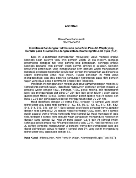 Rahmawati, Riska Dela and Rini, Yuli Puspito and Burhan, Amelia Handayani (2025) IDENTIFIKASI KANDUNGAN HIDROKUINON PADA KRIM PEMUTIH WAJAH YANG BEREDAR PADA E-COMMERCE DENGAN METODE KROMATOGRAFI LAPIS TIPIS (KLT). Diploma thesis, Politeknik Kesehatan Bhakti Setya Indonesia.