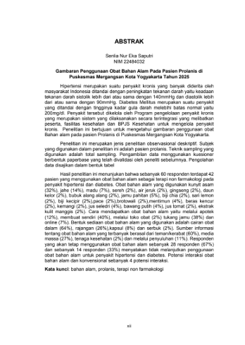 Saputri, Senlia Nur Eka and Utami, Artha Woro and Mayasari, Gita (2025) GAMBARAN PENGGUNAAN OBAT BAHAN ALAM PADA PASIEN PROLANIS DI PUSKESMAS MERGANGSAN KOTA YOGYAKARTA TAHUN 2025. Diploma thesis, Politeknik Kesehatan Bhakti Setya Indonesia.