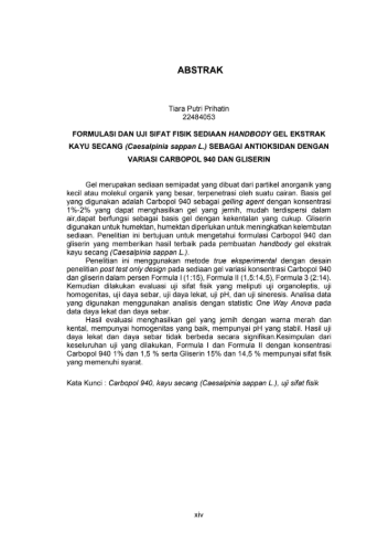 Gel merupakan sediaan semipadat yang dibuat dari partikel anorganik yang kecil atau molekul organik yang besar, terpenetrasi oleh suatu cairan. Basis gel yang digunakan adalah Carbopol 940 sebagai gelling agent dengan konsentrasi 1%-2% yang dapat menghasilkan gel yang jernih, mudah terdispersi dalam air, dapat berfungsi sebagai basis gel dengan kekentalan yang cukup. Gliserin digunakan untuk humektan, humektan diperlukan untuk meningkatkan kelembutan sediaan. Penelitian ini bertujuan untuk mengetahui formulasi Carbopol 940 dan gliserin yang memberikan hasil terbaik pada pembuatan handbody gel ekstrak kayu secang (Caesalpinia sappan L.).