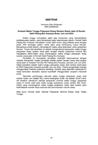 Wulansari, Veronica Dian and Ismiyati, Ismiyati and Utami, Artha Woro (2025) EVALUASI WAKTU TUNGGU PELAYANAN RESEP RACIKAN RAWAT JALAN DI RUMAH SAKIT PALANG BIRU KUTOARJO BULAN JUNI-JULI 2024. Diploma thesis, Politeknik Kesehatan Bhakti Setya Indonesia.