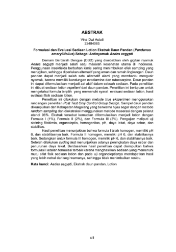 Demam Berdarah Dengue (DBD) yang disebabkan oleh gigitan nyamuk Aedes aegypti menjadi salah satu masalah kesehatan utama di Indonesia. Penggunaan insektisida berbahan kimia sering menimbulkan efek samping yang merugikan, sehingga diperlukan alternatif yang aman dan ramah lingkungan. Daun pandan dapat menjadi salah satu alternatif alami yang membantu mengusir nyamuk, karena memiliki kandungan evodiamine dan rutaecarpine. Daun pandan ini dapat diformulasikan menjadi zat aktif dalam sebuah sediaan. Pada penelitian ini dibuat sediaan lotion repellent dari daun pandan. Penelitian ini bertujuan untuk mengetahui formula terpilih yang memenuhi syarat evaluasi sediaan lotion, hasil evaluasi fisik sediaan lotion.