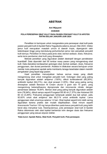 Penelitian ini bertujuan untuk menganalisis pola peresepan obat kulit pada pasien penyakit kulit di Apotek Ratna Yogyakarta selama Januari–Mei 2024. Infeksi jamur kulit merupakan masalah umum di daerah tropis, dipengaruhi oleh kelembapan tinggi yang mendukung pertumbuhan jamur dan penyebab penyakit kulit lainnya. Penelitian ini fokus pada jenis obat, bentuk sediaan, dosis, frekuensi, serta lama pemberian obat kulit yang diresepkan.