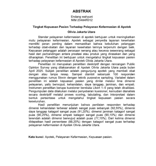 Wahyuni, Endang and Trilestari, Trilestari and Mardiyaningsih, Ana (2025) TINGKAT KEPUASAAN PASIEN TERHADAP PELAYANAN KEFARMASIAN DI APOTEK OLIVIA JAKARTA UTARA. Diploma thesis, Politeknik Kesehatan Bhakti Setya Indonesia.
