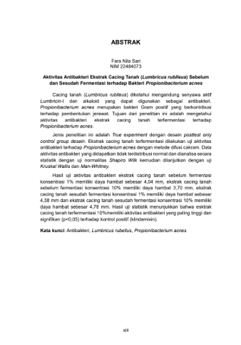 Jenis penelitian ini adalah True experiment dengan desain posttest only control group desain. Ekstrak cacing tanah terfermentasi dilakukan uji aktivitas antibakteri terhadap Propionibacterium acnes dengan metode difusi cakram. Data aktivitas antibakteri yang didapatkan tidak terdistribusi normal dan dianalisa secara statistik dengan uji normalitas Shapiro Wilk kemudian dilanjutkan dengan uji Kruskal Wallis dan Man-Whitney.