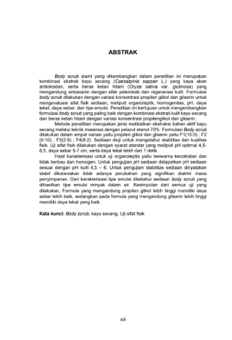 Body scrub alami yang dikembangkan dalam penelitian ini merupakan kombinasi ekstrak kayu secang (Caesalpinia sappan L.) yang kaya akan antioksidan, serta beras ketan hitam (Oryza sativa var. glutinosa) yang mengandung antosianin dengan efek pelembab dan regenerasi kulit. Formulasi body scrub dilakukan dengan variasi konsentrasi propilen glikol dan gliserin untuk mengevaluasi sifat fisik sediaan, meliputi organoleptik, homogenitas, pH, daya lekat, daya sebar, dan tipe emulsi. Penelitian ini bertujuan untuk mengembangkan formulasi body scrub yang paling baik dengan kombinasi ekstrak kulit kayu secang dan beras ketan hitam dengan variasi konsentrasi propilenglikol dan gliserin.