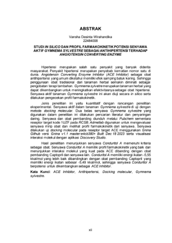 Wirahandika, Vansha Desinta and Ismiyati, Nur and Irianto, I.D.K. (2025) STUDI IN SILICO DAN PROFIL FARMAKOKINETIK POTENSI SENYAWA AKTIF GYMNEMA SYLVESTRE SEBAGAI ANTIHIPERTENSI TERHADAP ANGIOTENSIN CONVERTING ENZYME. Diploma thesis, Politeknik Kesehatan Bhakti Setya Indonesia.