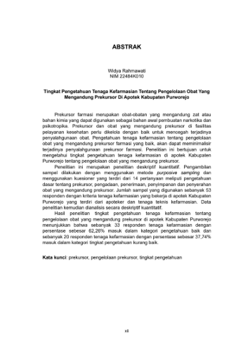 Rahmawati, Widya and Trilestari, Trilestari and Utami, Artha Woro (2025) TINGKAT PENGETAHUAN TENAGA KEFARMASIAN TENTANG PENGELOLAAN OBAT YANG MENGANDUNG PREKURSOR DI APOTEK KABUPATEN PURWOREJO. Diploma thesis, Politeknik Kesehatan Bhakti Setya Indonesia.