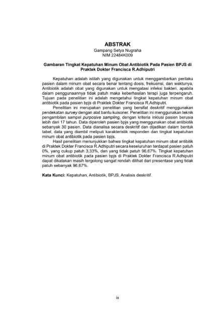 Nugraha, Gampang Setya and Trilestari, Trilestari and Ismiyati, Ismiyati (2025) GAMBARAN TINGKAT KEPATUHAN MINUM OBAT ANTIBIOTIK PADA PASIEN BPJS DI PRAKTEK DOKTER FRANCISCA R.ADHIPUTRI. Diploma thesis, Politeknik Kesehatan Bhakti Setya Indonesia.