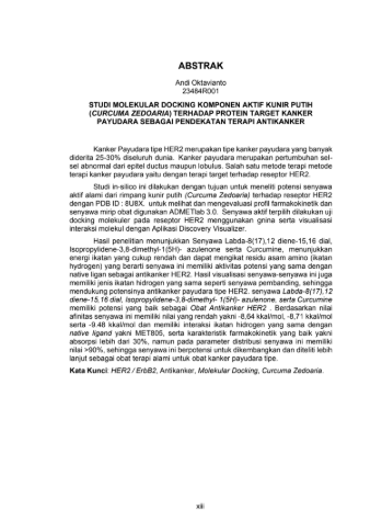 Oktavianto, Andi and Irianto, I.D.K. and Ismiyati, Nur (2025) STUDI MOLEKULAR DOCKING KOMPONEN AKTIF KUNIR PUTIH (CURCUMA ZEDOARIA) TERHADAP PROTEIN TARGET KANKER PAYUDARA SEBAGAI PENDEKATAN TERAPI ANTIKANKER. Diploma thesis, Politeknik Kesehatan Bhakti Setya Indonesia.