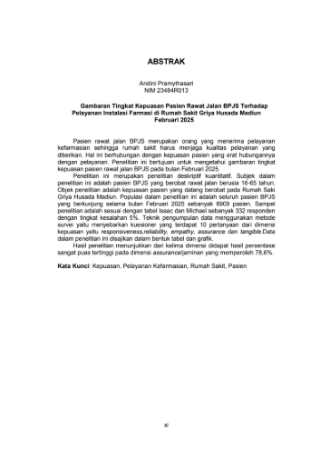Pramythasari, Andini and Wijayanti, Agustin and Ismiyati, Ismiyati (2025) GAMBARAN TINGKAT KEPUASAN PASIEN RAWAT JALAN BPJS TERHADAP PELAYANAN INSTALASI FARMASI DI RUMAH SAKIT GRIYA HUSADA MADIUN FEBRUARI 2025. Diploma thesis, Politeknik Kesehatan Bhakti Setya Indonesia.