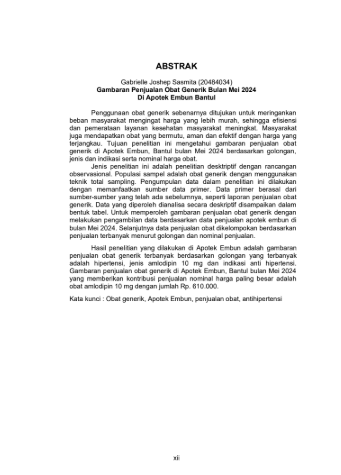 Sasmita, Gabrielle Joshep and Wijayanti, Agustin and Ismiyati, Ismiyati (2025) GAMBARAN PENJUALAN OBAT GENERIK BULAN MEI 2024 DI APOTEK EMBUN BANTUL. Diploma thesis, Politeknik Kesehatan Bhakti Setya Indonesia.