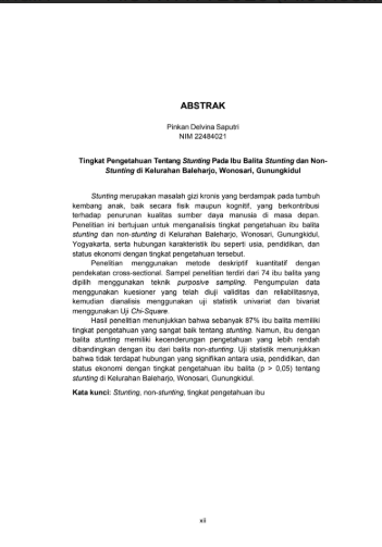 Saputri, Pinkan Delvina and Mardiyaningsih, Ana and Rahman, Catur Aryanto (2025) TINGKAT PENGETAHUAN TENTANG STUNTING PADA IBU BALITA STUNTING DAN NON-STUNTING DI KELURAHAN BALEHARJO, WONOSARI, GUNUNGKIDUL. Diploma thesis, Politeknik Kesehatan Bhakti Setya Indonesia.