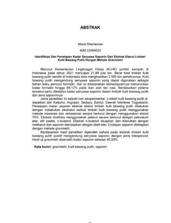 Menurut Kementerian Lingkungan Hidup (KLHK) jumlah sampah di Indonesia pada tahun 2021 mencapai 21,88 juta ton. Berat total limbah kulit bawang putih sendiri di Indonesia bisa menghasilkan 2.500 ton pertahunnya. Kulit bawang putih mengandung senyawa saponin yang dapat digunakan sebagai bahan baku pencuci formalin. Hal ini dikarenakan kemampuannya menurunkan kadar formalin hingga 89,12% pada ikan asin teri nasi. Berdasarkan potensi tersebut perlu diketahui kadar senyawa saponin dalam limbah kulit bawang putih dan jenis saponinnya.
