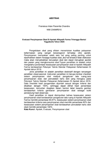 Chandra, Fransisca Intan Paramita and Wijayanti, Agustin and Utami, Artha Woro (2025) EVALUASI PENYIMPANAN OBAT DI APOTEK ALFAYADH FARMA TRIRENGGO BANTUL YOGYAKARTA TAHUN 2025. Diploma thesis, Politeknik Kesehatan Bhakti Setya Indonesia.