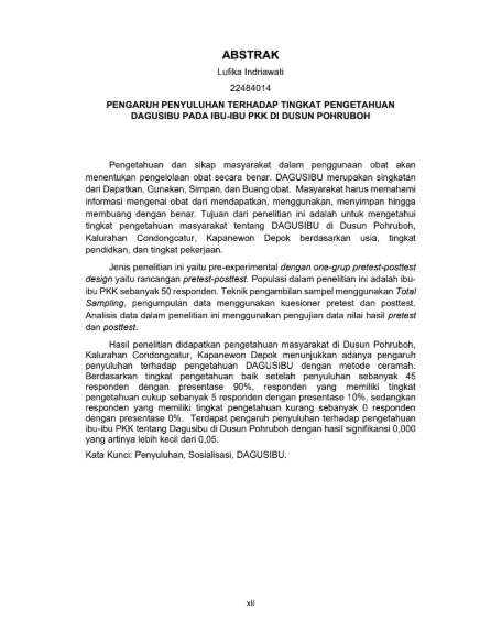 Indriawati, Lufika and Ismiyati, Nur and Widiastuti, Rina (2025) PENGARUH PENYULUHAN TERHADAP TINGKAT PENGETAHUAN DAGUSIBU PADA IBU-IBU PKK DI DUSUN POHRUBOH. Diploma thesis, Politeknik Kesehatan Bhakti Setya Indonesia.
