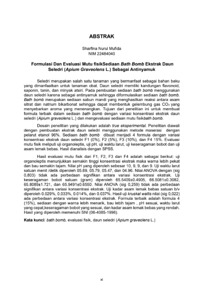 Mufida, Sharfina Nurul and Sulistyowati, Rini and Rini, Yuli Puspito (2025) FORMULASI DAN EVALUASI MUTU FISIK SEDIAAN BATH BOMB EKSTRAK DAUN SELEDRI (Apium graveolens L.) SEBAGAI ANTINYAMUK. Diploma thesis, Politeknik Kesehatan Bhakti Setya Indonesia.