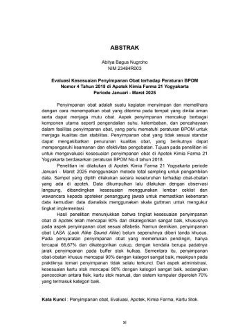 Nugroho, Abitya Bagus and Wijayanti, Agustin and Trilestari, Trilestari (2025) EVALUASI KESESUAIAN PENYIMPANAN OBAT TERHADAP PERATURAN BPOM NOMOR 4 TAHUN 2018 DI APOTEK KIMIA FARMA 21 YOGYAKARTA PERIODE JANUARI - MARET 2025. Diploma thesis, Politeknik Kesehatan Bhakti Setya Indonesia.