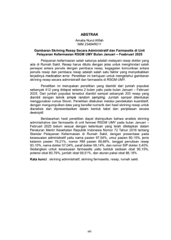 Afifah, Amalia Nurul and Wijayanti, Agustin and Utami, Artha Woro (2025) GAMBARAN SKRINING RESEP SECARA ADMINISTRATIF DAN FARMASETIS DI UNIT PELAYANAN FARMASI RSGM UMY BULAN JANUARI – FEBRUARI 2025. Diploma thesis, Politeknik Kesehatan Bhakti Setya Indonesia.