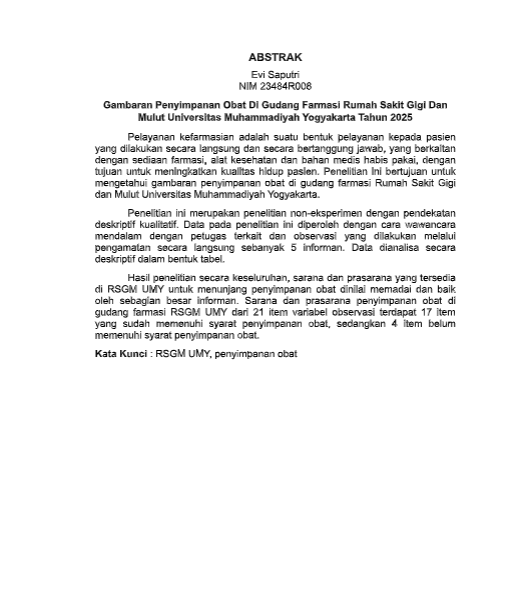 Saputri, Evi and Wijayanti, Agustin and Nurhaeni, Farisya (2025) GAMBARAN PENYIMPANAN OBAT DI GUDANG FARMASI RUMAH SAKIT GIGI DAN MULUT UNIVERSITAS MUHAMMADIYAH YOGYAKARTA TAHUN 2025. Diploma thesis, Politeknik Kesehatan Bhakti Setya Indonesia.