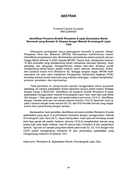 Gunawan, Emanuel Candra and Rini, Yuli Puspito and Sulistyowati, Rini (2025) IDENTIFIKASI PEWARNA SINTETIK RHODAMIN B PADA EYESHADOW MERAH BERMEREK YANG BEREDAR DI SHOPEE DENGAN METODE KROMATOGRAFI LAPIS TIPIS. Diploma thesis, Politeknik Kesehatan Bhakti Setya Indonesia.