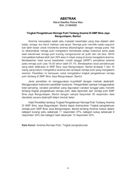 Mau, Maria Basilika Risma and Puspitasari, Ade and Utami, Artha Woro (2024) TINGKAT PENGETAHUAN REMAJA PUTRI TENTANG ANEMIA DI SMP BINA JAYA BANGUNTAPAN BANTUL. Diploma thesis, Politeknik Kesehatan Bhakti Setya Indonesia.