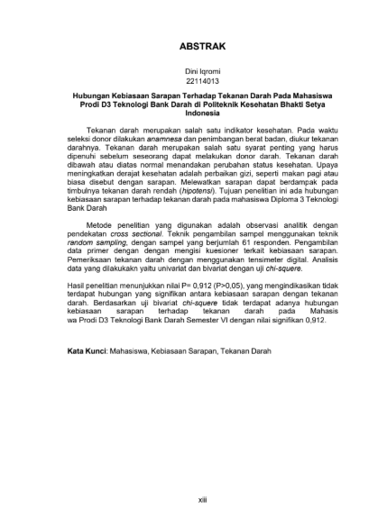 Iqromi, Dini and Aini, Resmi and Sinanto, Rendi Ariyanto (2025) HUBUNGAN KEBIASAAN SARAPAN TERHADAP TEKANAN DARAH PADA MAHASISWA PRODI DIPLOMA 3 TEKNOLOGI BANK DARAH. Diploma thesis, Politeknik Kesehatan Bhakti Setya Indonesia.