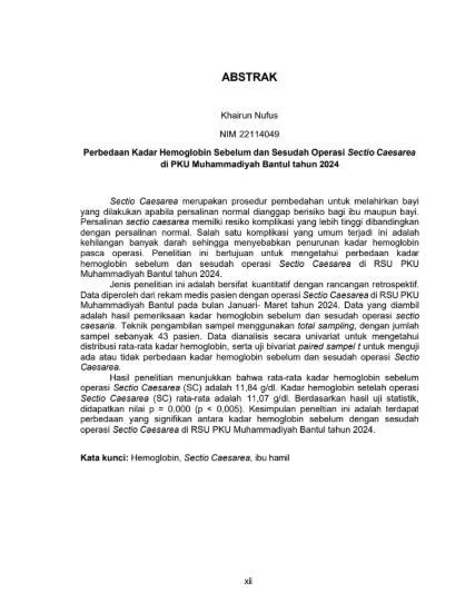 Nufus, Khairun and Ratih, Woro Umi and Setianingsih, Ika Sulis (2025) PERBEDAAN KADAR HEMOGLOBIN SEBELUM DAN SESUDAH OPERASI SECTIO CAESAREA DI RSU PKU MUHAMMADIYAH BANTUL TAHUN 2024. Diploma thesis, Politeknik Kesehatan Bhakti Setya Indonesia.