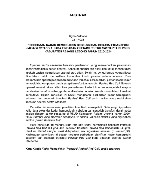 Ardhana, Ryan and Ratih, Woro Umi and Setyaningsih, Ika Sulis (2025) PERBEDAAN KADAR HEMOGLOBIN SEBELUM DAN SESUDAH TRANSFUSI PACKED RED CELL PADA TINDAKAN OPERASI SECTIO CAESAREA DI RSUD KABUPATEN REJANG LEBONG TAHUN 2020-2024. Diploma thesis, Politeknik Kesehatan Bhakti Setya Indonesia.