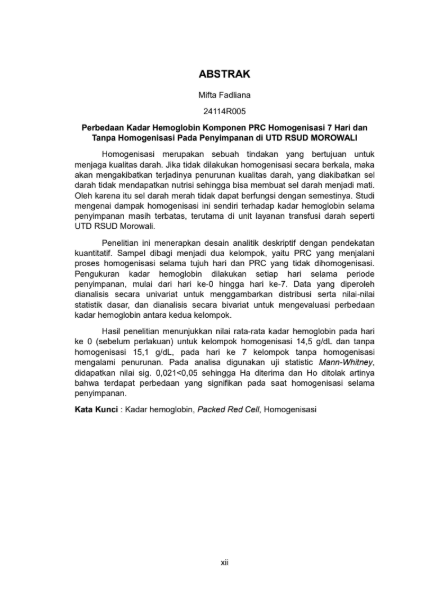 Fadliana, Mifta and Hartini, Windadari Murni and Rahmatullah, Widia (2025) PERBEDAAN KADAR HEMOGLOBIN KOMPONEN PRC HOMOGENISASI 7 HARI DAN TANPA HOMOGENISASI PADA PENYIMPANAN DI UTD RSUD MOROWALI. Diploma thesis, Politeknik Kesehatan Bhakti Setya Indonesia.