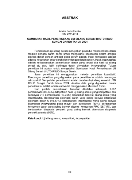 Herika, Abelia Febri and Ratih, Woro Umi and Arsita, Emilia Vivi (2025) GAMBARAN HASIL PEMERIKSAAN UJI SILANG SERASI DI UTD RSUD SUNGAI DAREH TAHUN 2024. Diploma thesis, Politeknik Kesehatan Bhakti Setya Indonesia.