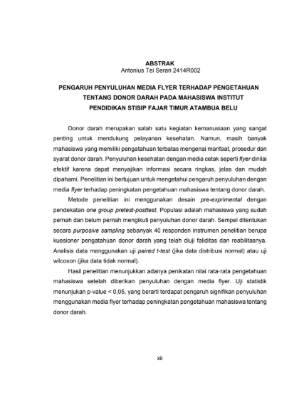 Seran, Antonius Tei and Rosyidah, Rudina Azimata and Setianingsih, Ika Sulis (2025) PENGARUH PENYULUHAN MEDIA FLYER TERHADAP PENGETAHUAN TENTANG DONOR DARAH PADA MAHASISWA INSTITUT PENDIDIKAN STISIP FAJAR TIMUR ATAMBUA BELU. Diploma thesis, Politeknik Kesehatan Bhakti Setya Indonesia.