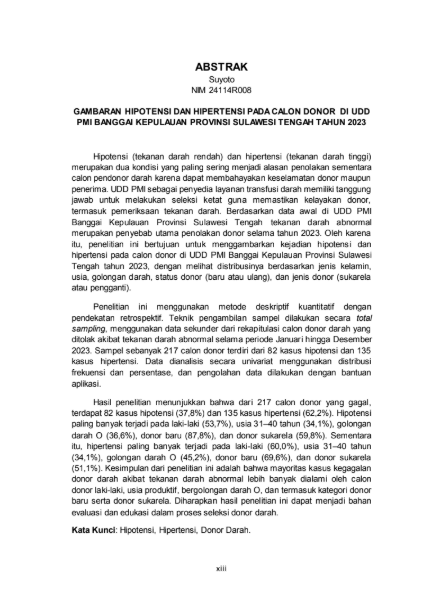 Suyoto, Suyoto and Aini, Resmi and Arsita, Emilia Vivi (2025) GAMBARAN HIPOTENSI DAN HIPERTENSI PADA CALON DONOR DI UDD PMI BANGGAI KEPULAUAN PROVINSI SULAWESI TENGAH TAHUN 2023. Diploma thesis, Politeknik Kesehatan Bhakti Setya Indonesia.