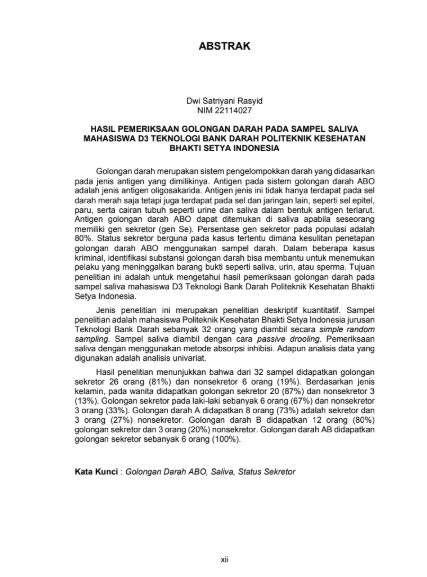 Golongan darah merupakan sistem pengelompokkan darah yang didasarkan pada jenis antigen yang dimilikinya. Antigen pada sistem golongan darah ABO adalah jenis antigen oligosakarida. Antigen jenis ini tidak hanya terdapat pada sel darah merah saja tetapi juga terdapat pada sel dan jaringan lain, seperti sel epitel, paru, serta cairan tubuh seperti urine dan saliva dalam bentuk antigen terlarut. Antigen golongan darah ABO dapat ditemukan di saliva apabila seseorang memiliki gen sekretor (gen Se). Persentase gen sekretor pada populasi Adalah 80%. Status sekretor berguna pada kasus tertentu dimana kesulitan penetapan golongan darah ABO menggunakan sampel darah. Dalam beberapa kasus kriminal, identifikasi substansi golongan darah bisa membantu untuk menemukan pelaku yang meninggalkan barang bukti seperti saliva, urin, atau sperma. Tujuan penelitian ini adalah untuk mengetahui hasil pemeriksaan golongan darah pada sampel saliva mahasiswa D3 Teknologi Bank Darah Politeknik Kesehatan Bhakti Setya Indonesia.
