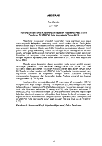 Hipertensi merupakan masalah kesehatan yang signifikan dan dapat mempengaruhi kelayakan seseorang untuk mendonorkan darah. Peningkatan tekanan darah dapat menyebabkan risiko kesehatan yang serius, termasuk stroke dan serangan jantung. Salah satu faktor terjadinya peningkatan tekanan darah yaitu kafein yang terkandung dalam kopi diduga dapat meningkatkan tekanan darah, sehingga penting untuk memahami dampaknya terhadap calon pendonor. Penelitian ini bertujuan untuk menganalisis hubungan antara konsumsi kopi dengan kejadian hipertensi pada calon pendonor di UTD PMI Kota Yogyakarta tahun 2025.