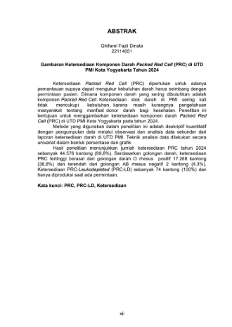 Dinata, Ghifarel Fazli and Astarini, Dian Eko and Sinanto, Rendi Ariyanto (2025) GAMBARAN KETERSEDIAAN KOMPONEN DARAH PACKED RED CELL (PRC) DI UTD PMI KOTA YOGYAKARTA TAHUN 2024. Diploma thesis, Politeknik Kesehatan Bhakti Setya Indonesia.