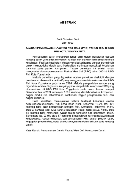 Suci, Putri Oktaviani and Astarini, Dian Eko and Setianingsih, Ika Sulis (2025) ALASAN PEMUSNAHAN PACKED RED CELL (PRC) TAHUN 2024 DI UDD PMI KOTA YOGYAKARTA. Diploma thesis, Politeknik Kesehatan Bhakti Setya Indonesia.