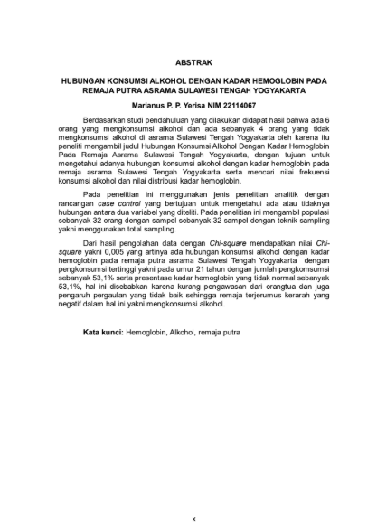 Berdasarkan studi pendahuluan yang dilakukan didapat hasil bahwa ada 6 orang yang mengkonsumsi alkohol dan ada sebanyak 4 orang yang tidak mengkonsumsi alkohol di asrama Sulawesi Tengah Yogyakarta oleh karena itu peneliti mengambil judul Hubungan Konsumsi Alkohol Dengan Kadar Hemoglobin Pada Remaja Asrama Sulawesi Tengah Yogyakarta, dengan tujuan untuk mengetahui adanya hubungan konsumsi alkohol dengan kadar hemoglobin pada remaja asrama Sulawesi Tengah Yogyakarta serta mencari nilai frekuensi konsumsi alkohol dan nilai distribusi kadar hemoglobin.